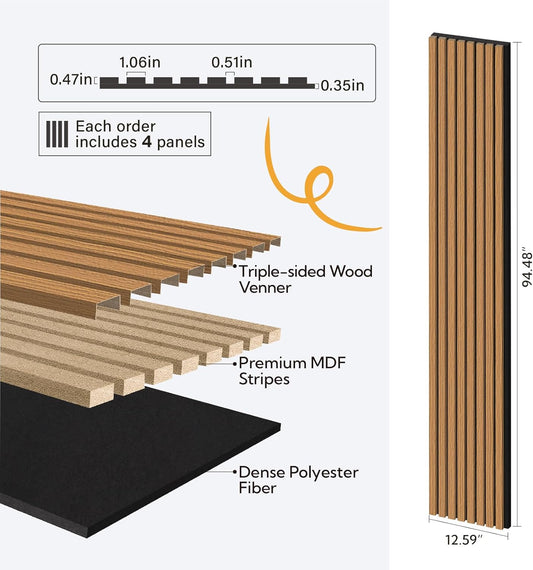 Olanglab Wood Slat Wall Panels 4 Pack, Wooden Acoustic Wall Panels, 94.5"x12.6" Each 3D Wall Panels for Interior Wall Decor (Warm Oak-Extendo Trio)