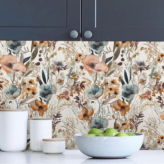 Boho Light Brown Flowers Teal Blue Floral Leaf Plants Vintage Watercolor Peel and Stick Wallpaper Self Adhesive Removable Easy Peel Off Stick on Wall Paper for Bedroom Cabinet Renter