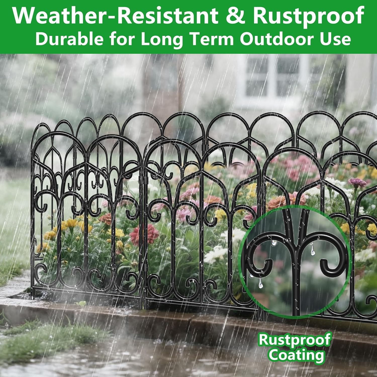 - DECORATIVE&STURDY: The arched iron arts design make this ornamental steel garden border fence itself a decorative element for your garden and add more delights to your life, accent border with classic rod iron design to fit any decor; Powder coating surface will help protect this decorative fences borders against rust and extend its life, which makes it perfect garden fencing for yard outdoor landscape.It is weather resistant and will still looks shiny and elgent after years aroung,the black color won't fade over time.