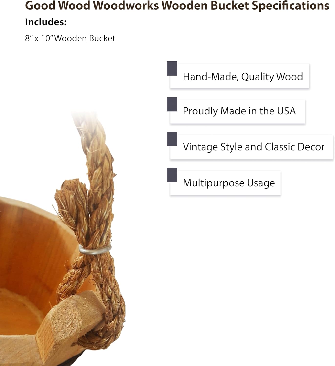 Good Wood - Wooden Bucket 8" x 10" Water Wishing Well Pail with Rope Twine Handle Solid Wood Vintage Style Primitive Planter - Made in The USA