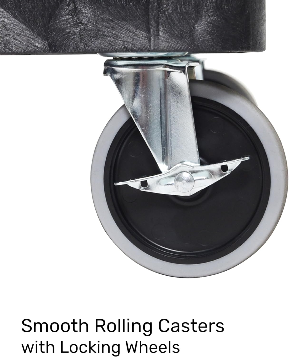 - High-Quality Construction for Lasting Durability: Designed with rounded corners and built from high-density polyethylene (HDPE), this black utility cart features two spacious shelves with 2.5” deep tubs for secure storage. The 19.5” clearance between shelves accommodates larger items with ease.