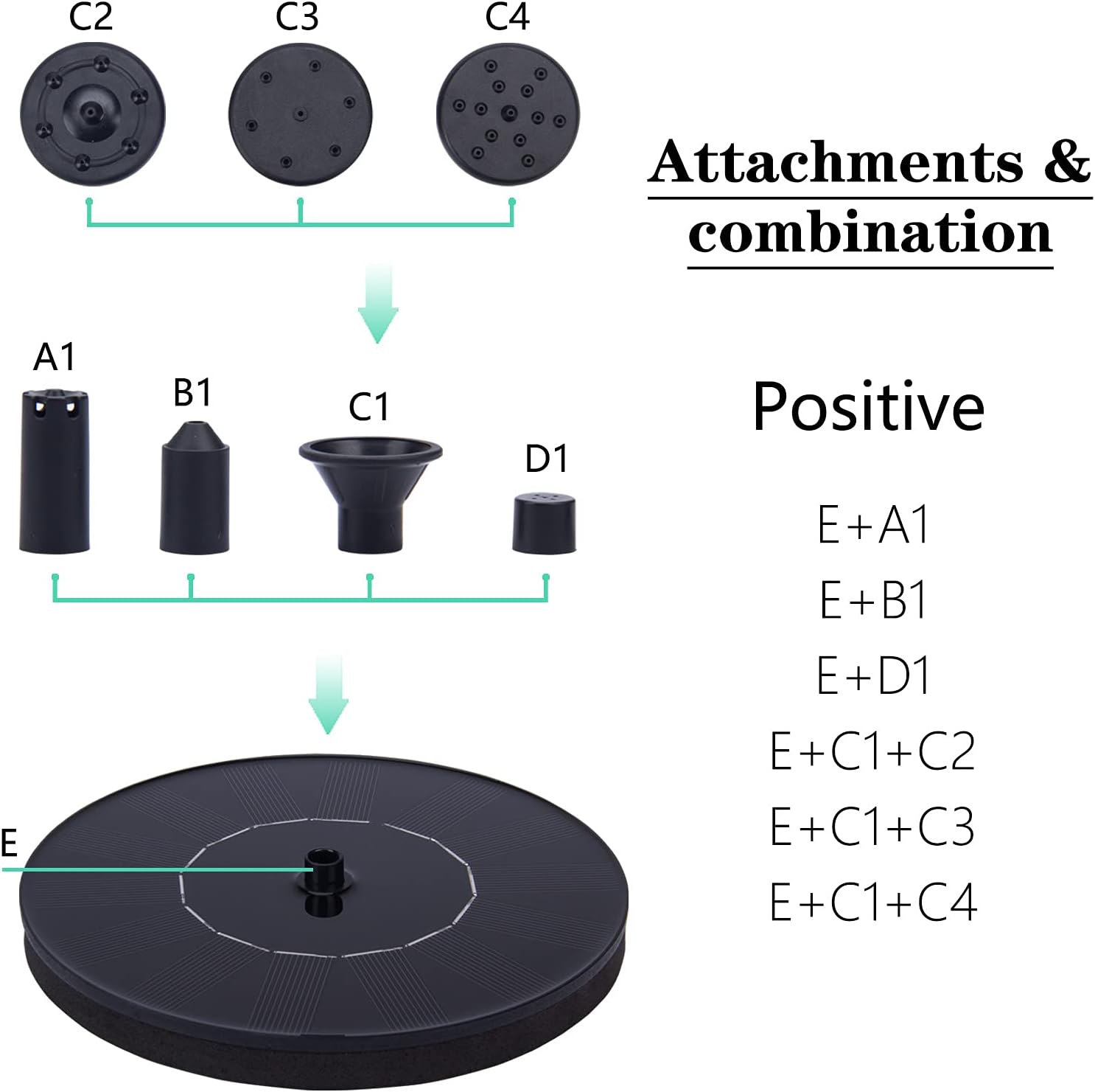 - [4 Nozzles] This solar water pump kit with 4 nozzles allows you to choose fountain water patterns at will.The dynamic solar fountain may attract birds or other small animals to make your garden more beautiful and energetic.