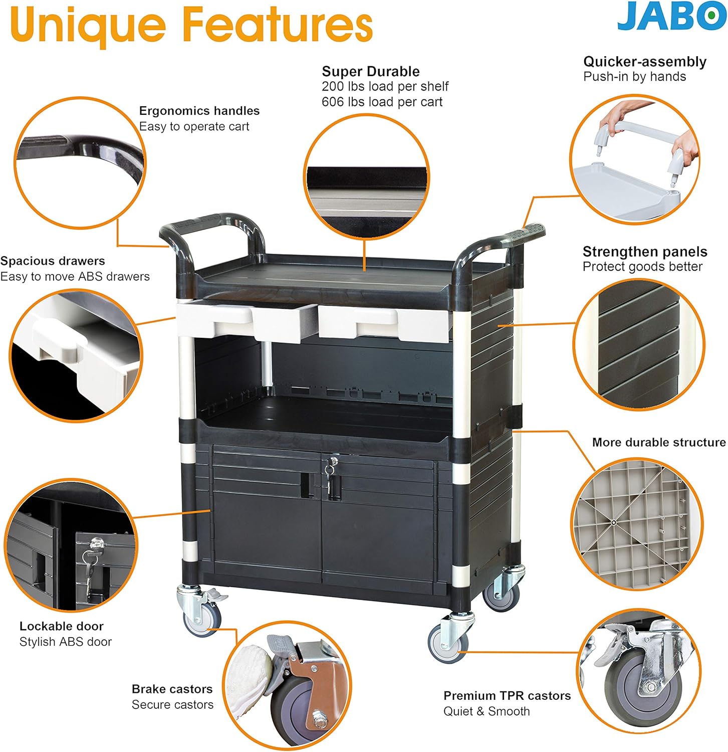 - ✅ HEAVY DUTY COMMERCIAL GRADE: This reliable JaboEquip Utility Cart with one set of lockable doors which are made of commercial reinforced top grade materials and ABS medical doors, Aluminum legs and medical grade TPR castors. It can hold up to 606 lbs per cart.