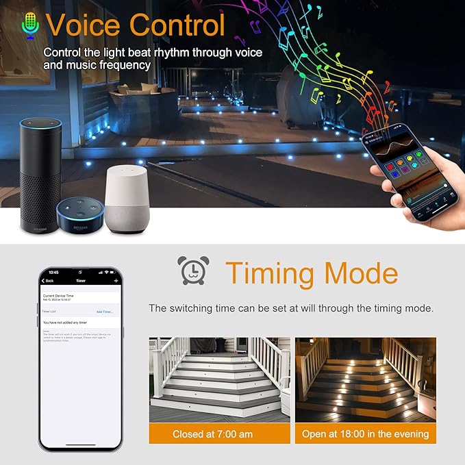 - Deck Lights IP67 Waterproof: The deck step lights, adapter and wifi led controller are all IP67 rated, lights made of high quality stainless steel and PC, connected by waterproof connectors to ensure waterproof, durable and corrosion-resistant. Ideal landscape lighting for path, walkways, decks, stairs, railings, kitchen floor, front steps, pool and outdoor visual identifier.