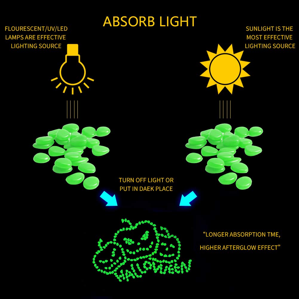 - GLOW IN THE DARK PEBBLES: These glowing rocks absorb and store energy from sunlight and other light sources,light up in dark environments. These glowing pebbles can glow for up to 1 to 2 hours in darkness after a full day in the sun.These glow stones are green in the day, but they are going to be Blue glow pebble rocks at night! Please radiate them with light again if they are not bright enough.