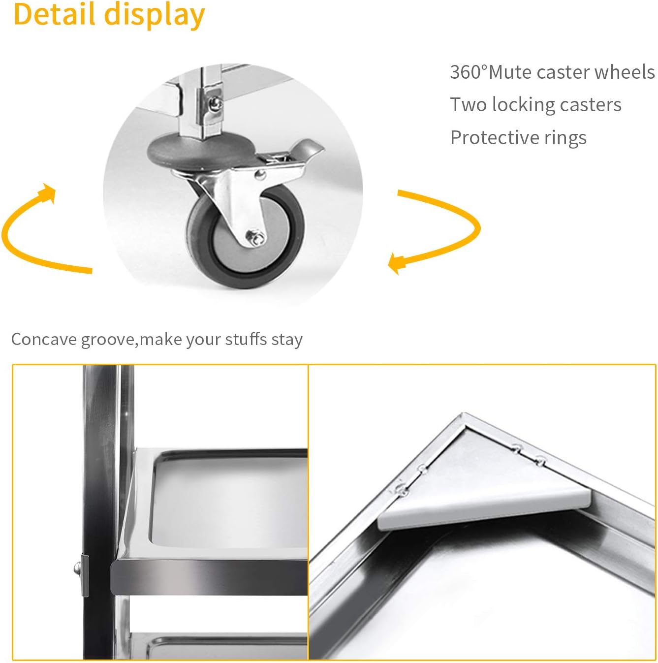 - Safe and Quiet wheels : 2 Swivel casters, 2 with brakes silent wheels allow the service cart stop safely and move quietly.Also making the stainless steel cart more convenient for you to use, you are not afraid of uneven terrain