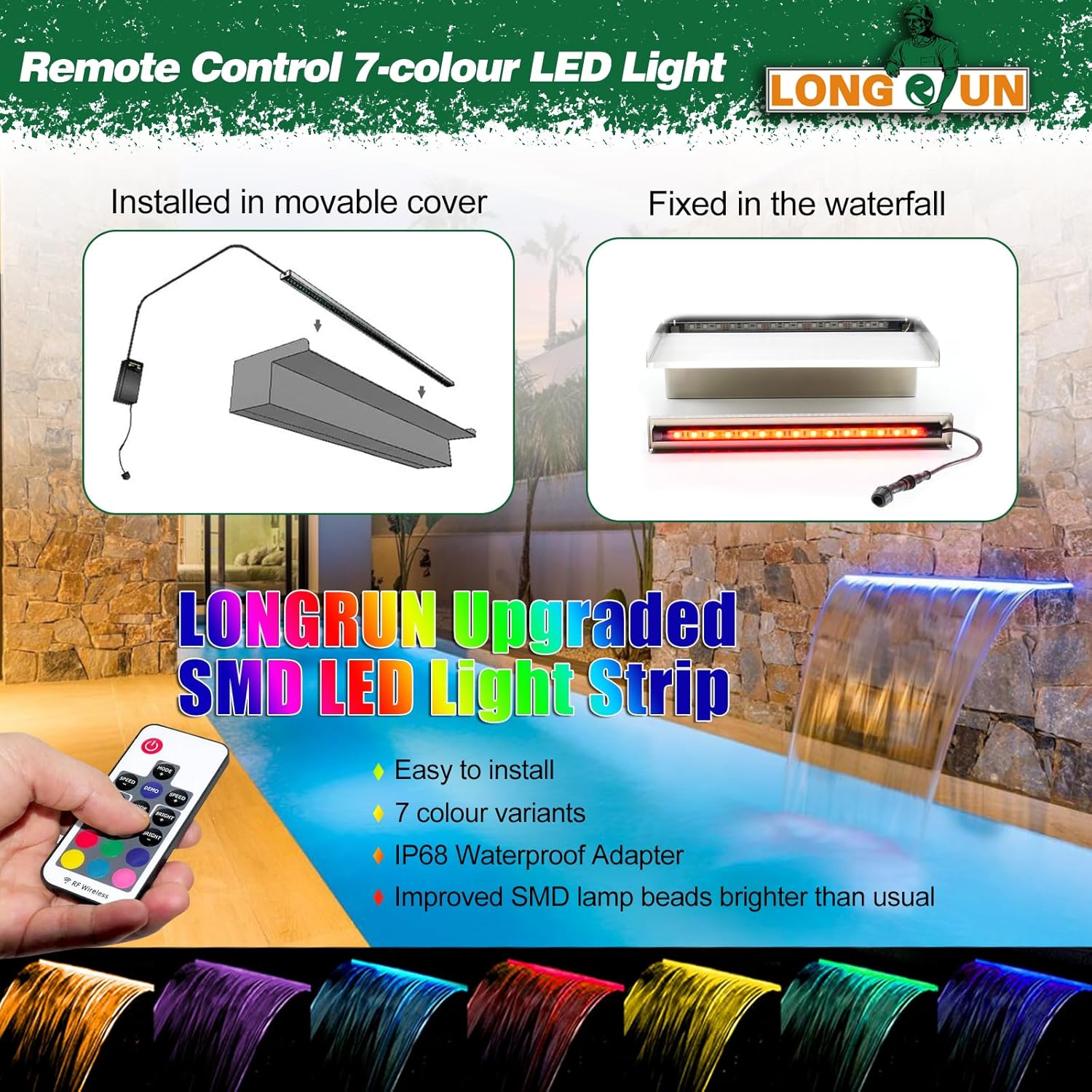 - 【Decoration Waterfall】LONGRUN waterfall spillway will make a decorative addition to your garden patio pond or swimming pool, it makes them more elegant, fashionable and beautiful. The color change of LED lights and the gentle sound of water running make your patio more special at night.