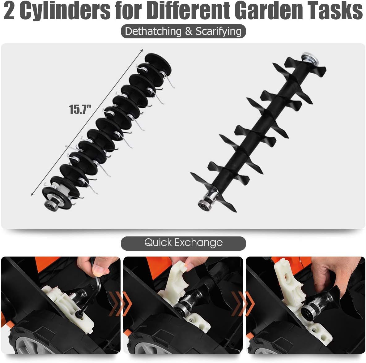 - 【2-In-1 Dethatcher & Scarifier】Equipped with a powerful 13 amp motor, this dual-function electric lawn mower can rack 15" path to get the heavy mowing and scarifying job done at fast speed. And you can easily change the cylinders in a few minutes. Besides, this machine has a 13.5 gallon collection bag to gather weeds automatically.
