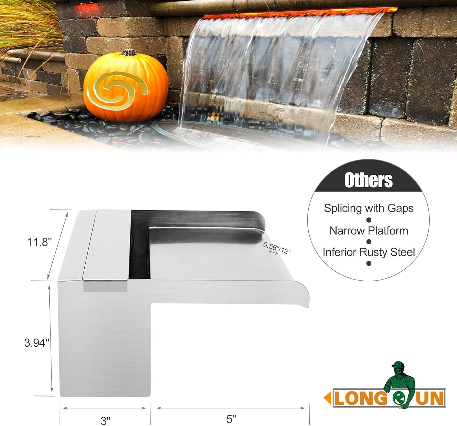 - 【Decoration Waterfall】LONGRUN waterfall spillway will make a decorative addition to your garden patio pond or swimming pool, it makes them more elegant, fashionable and beautiful. The color change of LED lights and the gentle sound of water running make your patio more special at night.
