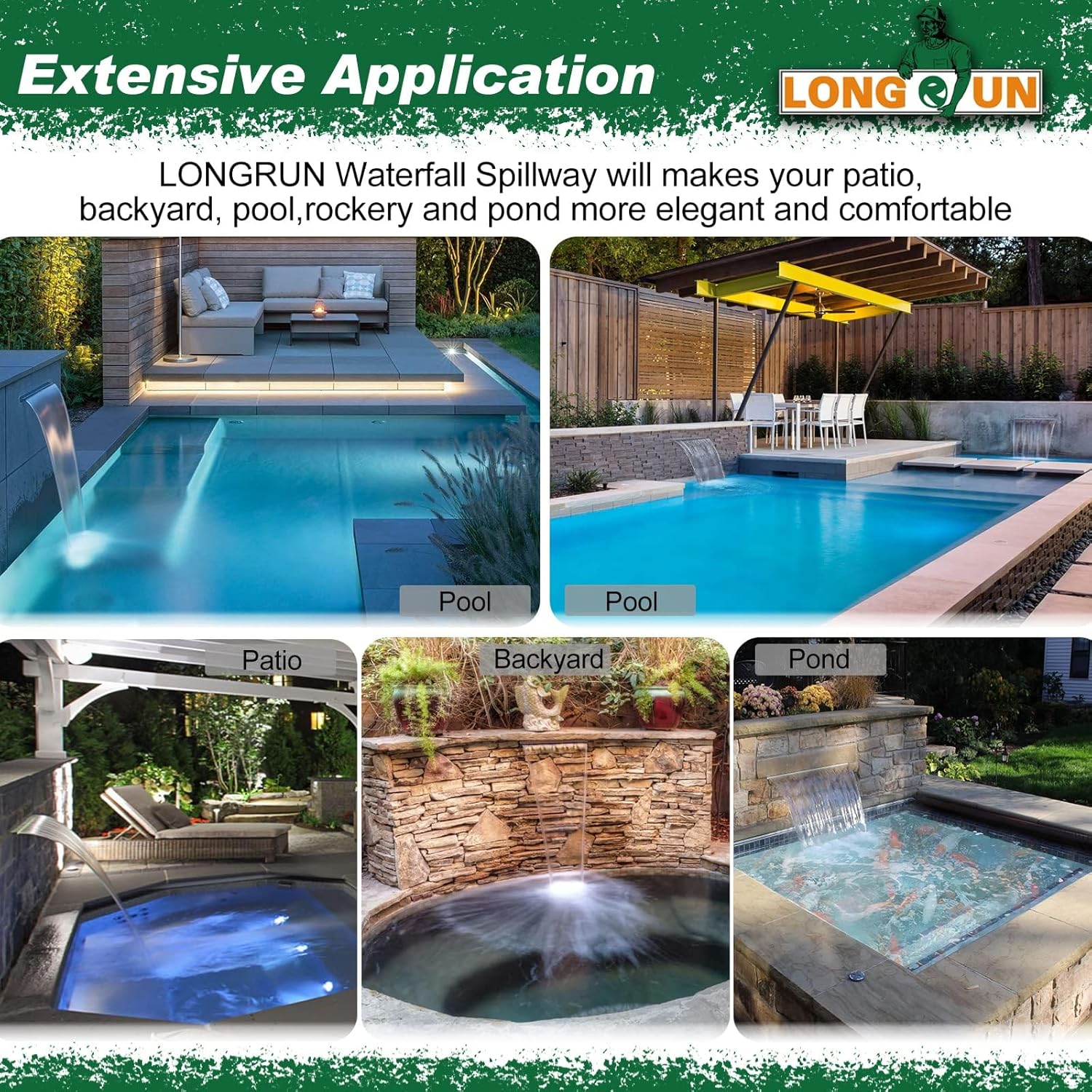 - 【Decoration Waterfall】LONGRUN waterfall spillway will make a decorative addition to your garden pond or swimming pool, it makes them more elegant, fashionable and beautiful. The multi-color lights and the gentle sound of water running make your patio more special at night.