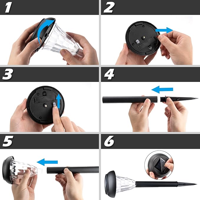 - 【Quick and Easy Installation】No tools required – just follow a few simple instructions. Wireless set up and operation. Just turn your solar lights for outside ON with a simple switch and push solar outdoor lights into the ground with a sturdy stake. See simple steps below