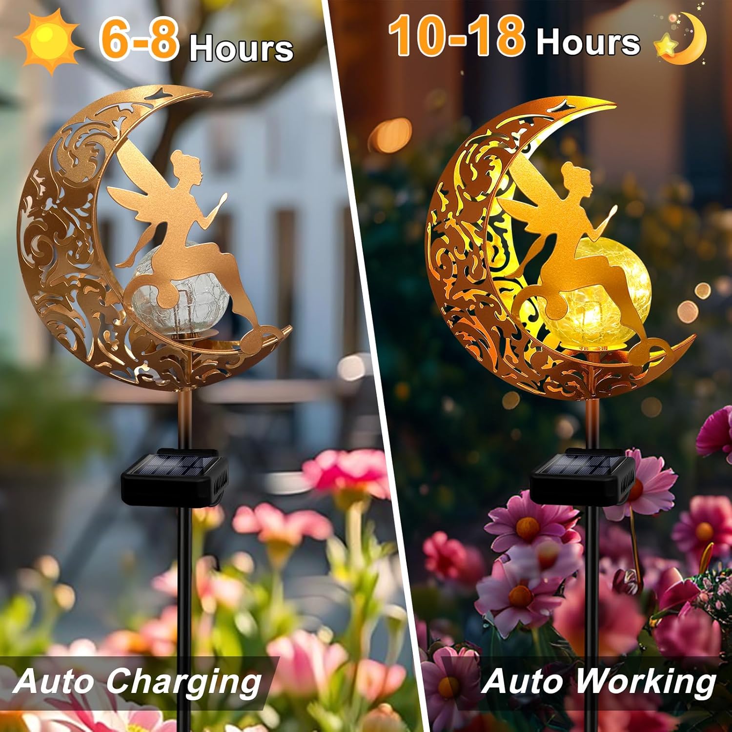 - 【The Perfect Gift Idea】: This Garden Solar Fairy Lights is a unique blend of craftsmanship and charm, featuring a handmade Glass Globe and fairy design with cute moon decor. Its whimsical fairy and moon motifs create a magical ambiance, making it the ideal gift to express your love. Fun garden decor for outside, garden angel for Mother's Day, Birthday, Father's Day, Thanksgiving Day, Valentine's Day, Christmas or memorial day. This solar garden light can be a great gift for different occasions.