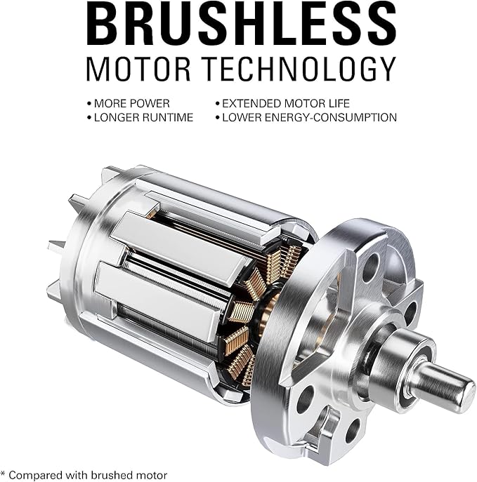 - BRUSHLESS MOTOR TECHNOLOGY : 2 x more torque. Provides more power, longer runtimes, quiet operation, and extended motor life