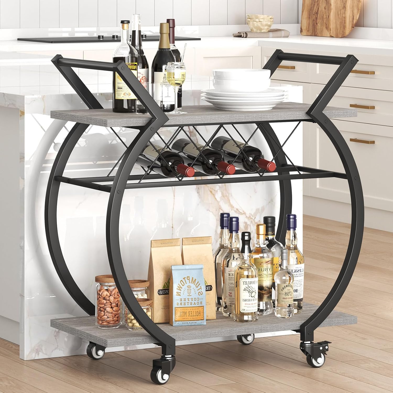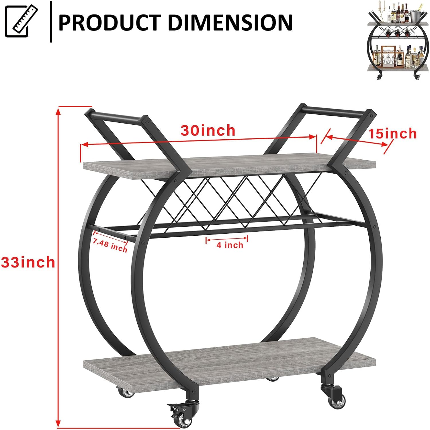 LVB Bar Cart with Wine Rack, 2 Tier Farmhouse Kitchen Cart on Wheels, Modern Wood and Metal Portable Coffee Cart Table for Home, Utility Industrial Mobile Serving Cart with Storage Shelf, Grey Oak
