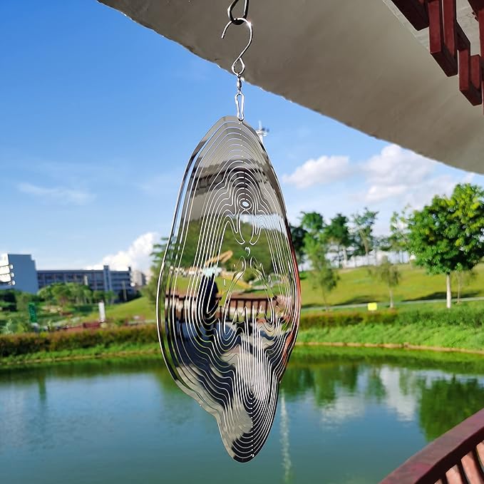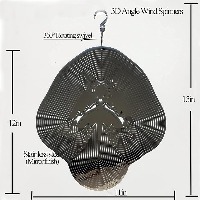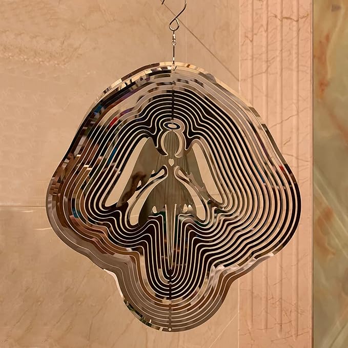 - Mirror reflection design makes it more charming and gorgeous than a colored angel wind spinners. Depending on the environment and light, it can take on different colors. Elegant and natural,This windmill is your ideal garden decor. Just hang it anywhere you want and you canenjoy it. Stainless steel material, can adapt to all kinds of weather, whether sunny, cloudy or rainy.With strong corrosion resistance, wear resistance and rust resistance.