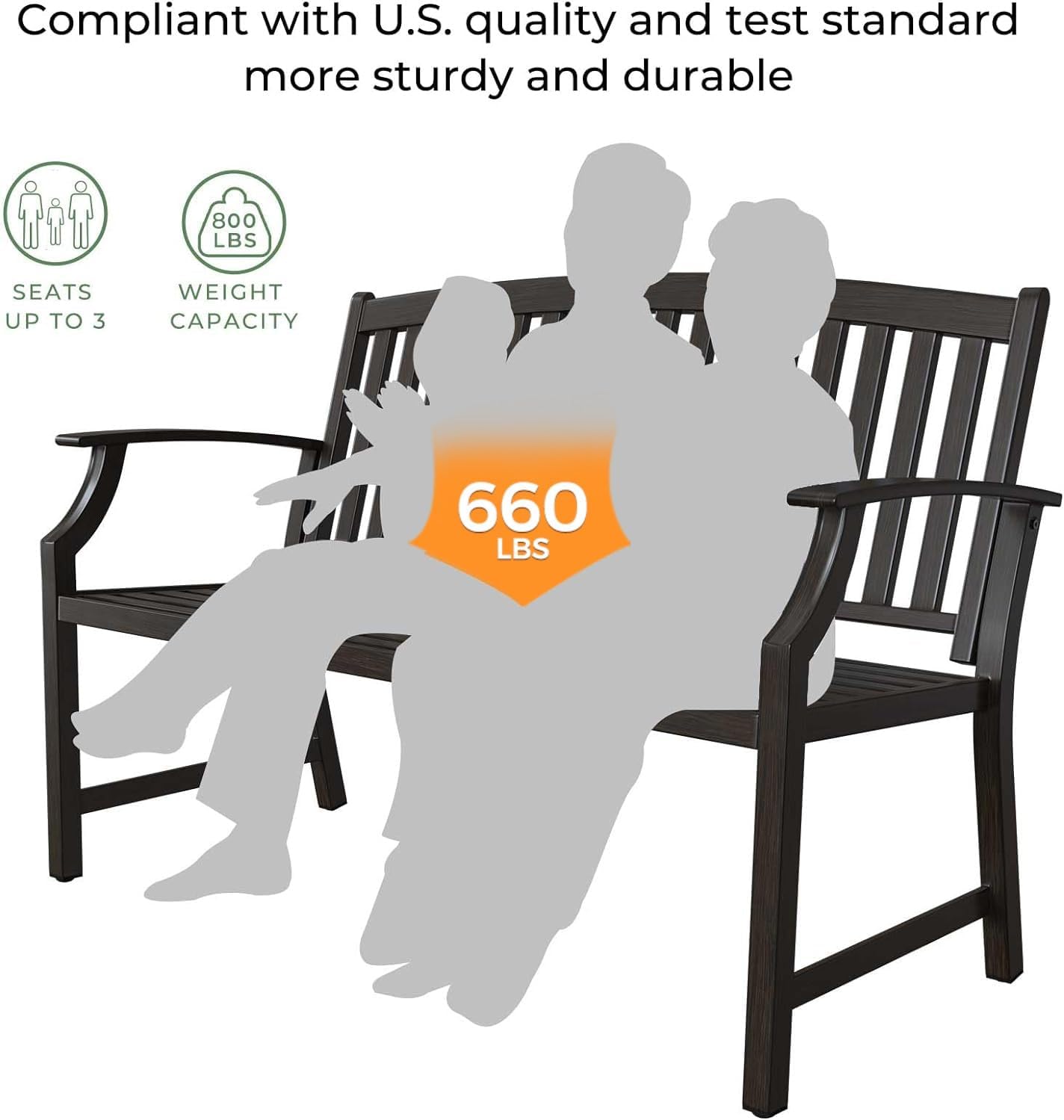 - 【STURDY STRUCTURE】This metal frame of outside bench provide thickened iron pipes and aluminum back and seat that have better strength, can hold up to 660 Pounds