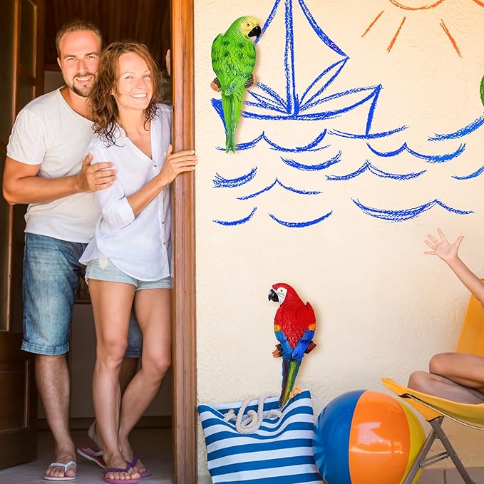 2 Pieces Parrot Decor Outdoor Tiki Bar Decorations Large Realistic Parrot Statues for Outside Lifelike Bird Sculptures Garden Patio Yard Lawn Figurines for Tropical Animal Tree Wall (Green, Red)