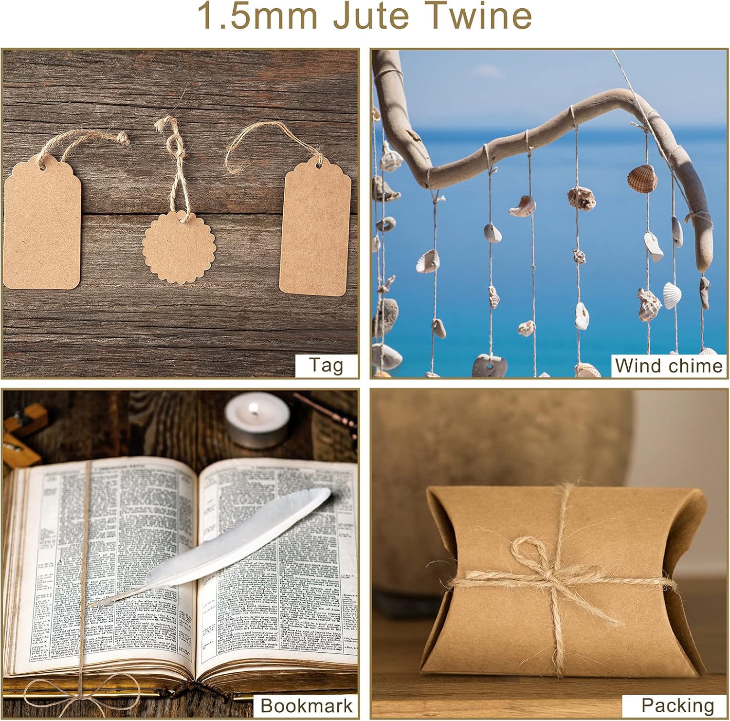- 【Muti-Purpose】The 1.5mm and 2mm jute twine suitable for making hang tags, lanyards,gift packaging, knitting, etc.The 3mm perfect for DIY decorating all kinds of things,scrapbooking, hanging gift tags, wrapping packages, hanging decorations, gardening applications, or any arts and crafts project.The 6mm suitable for winding cat scratch boards, pipes, escalators, various walls, etc.