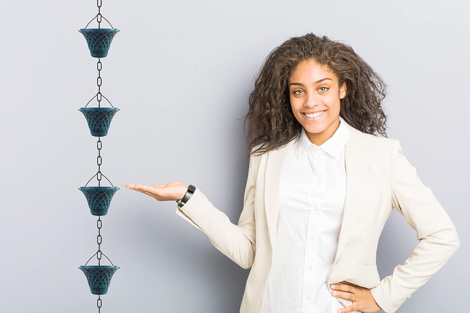 - EXQUISITE DESIGN: Featuring 12 beautifully ornate bell cups, our rain chain adds a chic touch to your roof, awning, or shed. Moreover, the rain chains are painted in an antique sky blue color on the outside and inside, to perfectly complement your roof and garden décor.