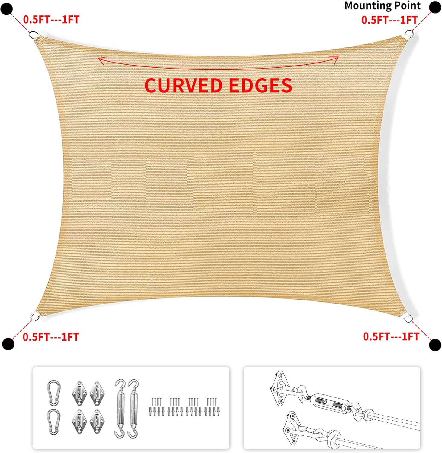 - Measurement is taken from corner to corner, edges are made slightly curved based on precisely calculated radian, prevent shade sail from sagging in the middle for best appearance and performance.