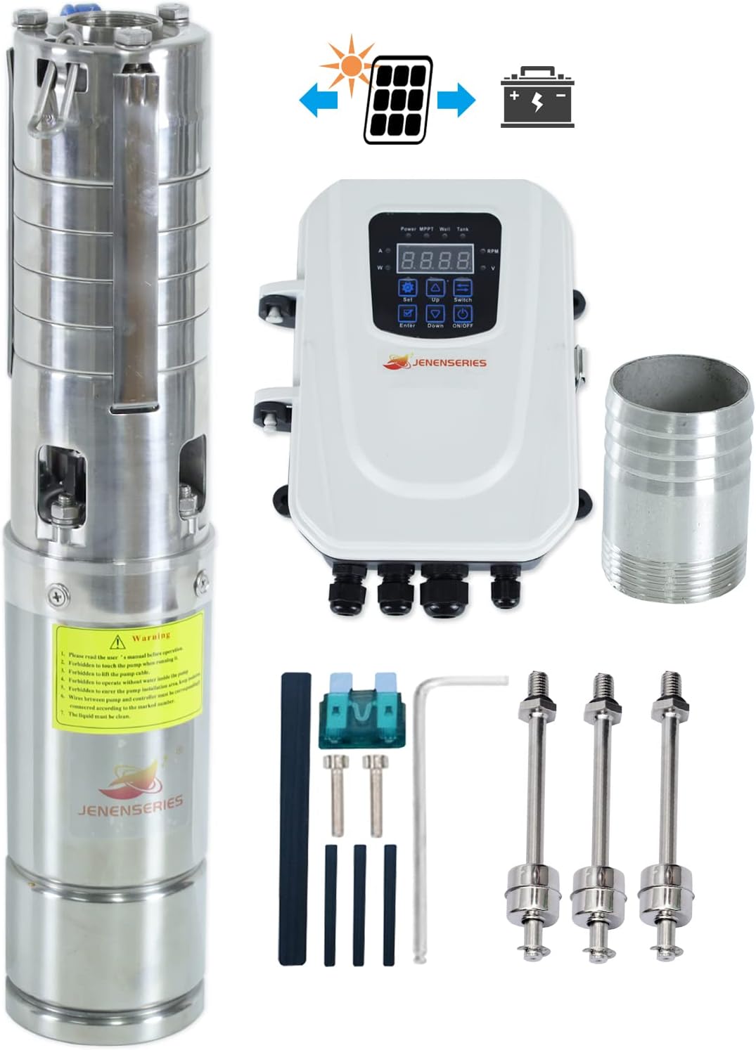 - [Specification]: JENENSERIES Solar Water Pump 48V DC,4 Inch Dia,9.8ft extension cable, Max head 40m(131ft),7m³/h (30.7GPM)Flow, PV open circuit voltage 42-100V with MPPT controller for farm, Garden, home, pool, Industrial