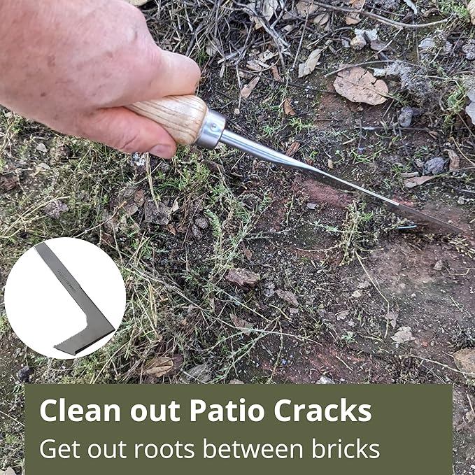 - Weed Scraping Tool - This "L" shaped tool lets you quickly scrape weeds off of patios and clear out weeds between cracks in bricks and pavers. This crevice cleaning and paving knife tool will clean your patio in minutes.