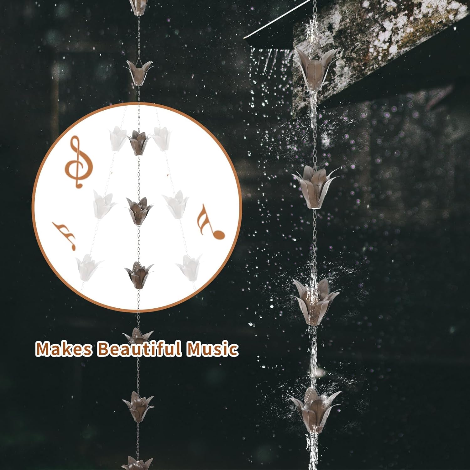 - Adjustable Rain Chain: The length is about 94.5 inches, the length can be adjusted by removing. Comes with 10 flower shapes that are removed to adjust the length of the rain chain to fit your house and garden. Flower-shaped rain chain decoration brings a mysterious feeling to people. When you sit in the garden and drink tea, the wind blowing in front of you makes the rain chain float gently in the air, adding luster to your garden