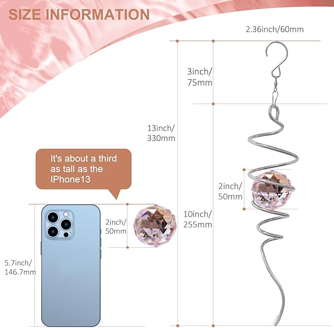 - 【 Meaningful Unique Gifts 】Pink Crystal symbolizes love and happiness. The Gazing Ball Spiral Tail Wind Spinner came in a beautiful gift box that was easily giftable. This magic ball spiral tail is a wonderful gift that will be a hit as a birthday gift, Thanksgiving gift, Christmas gift, housewarming gift, garden gift, Decor gift, etc.. The wind spiral with crystal ball is a perfect gift for birthdays, Thanksgiving Day, Christmas, etc. and any you loved people ( family, friend, etc.).