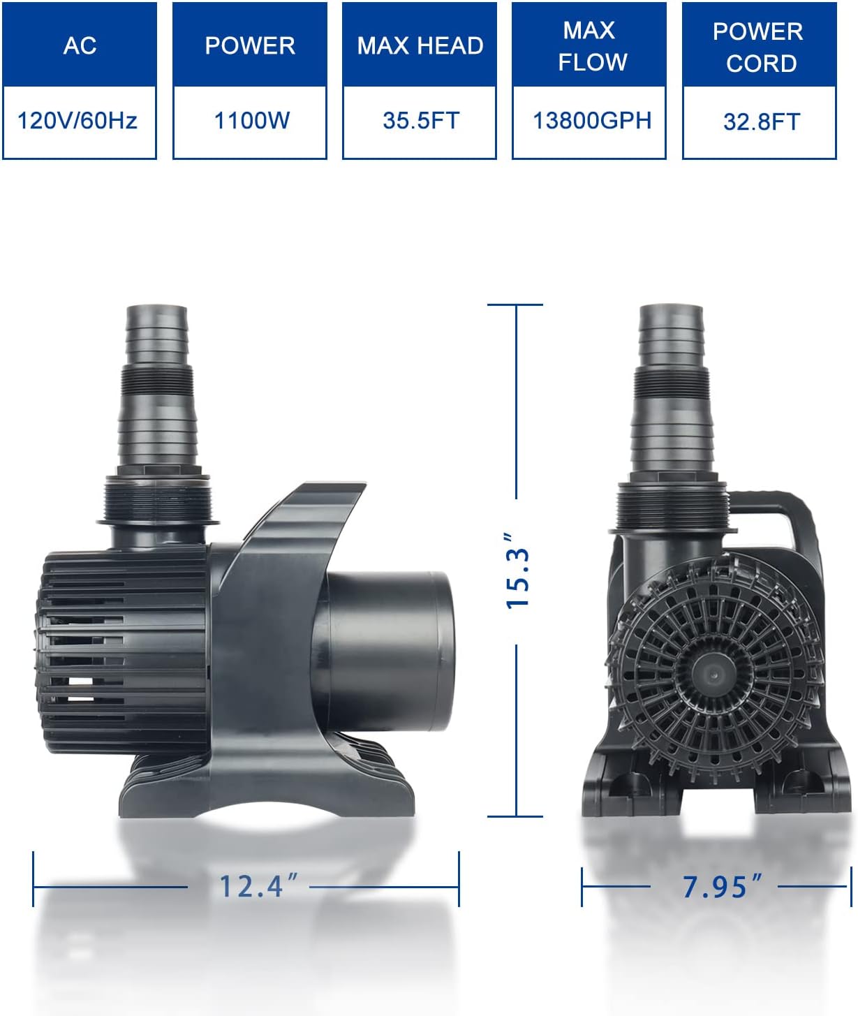 - 【Cuter & Stronger Water Flow】-AS CLEAN AS “ SPIRIT LIVES IN US"-Smarter &Powerful & QUIET pond pump, as "In quietness is your strength": 13800gph pond water-fall pump submersible outdoor is very powerful with 13800gph high flow and 35 feet high lift.It can move a larger volume of water to build water flow of waterfall or fountain in yard. although pond water-fall pump submersible outdoor is powerful, doesn’t make much noise at all, when pumping except for the soothing sound of splashing water