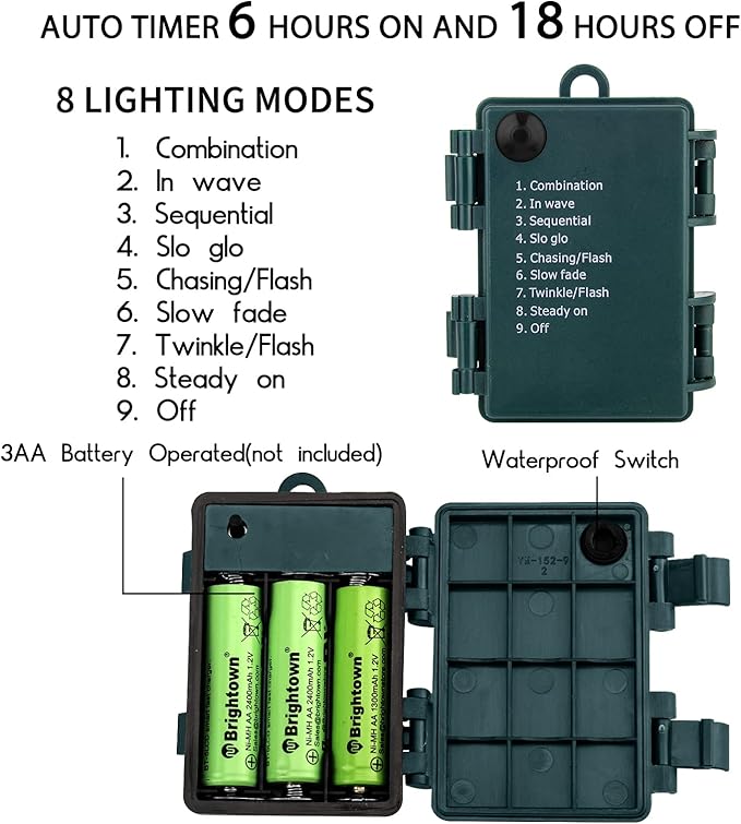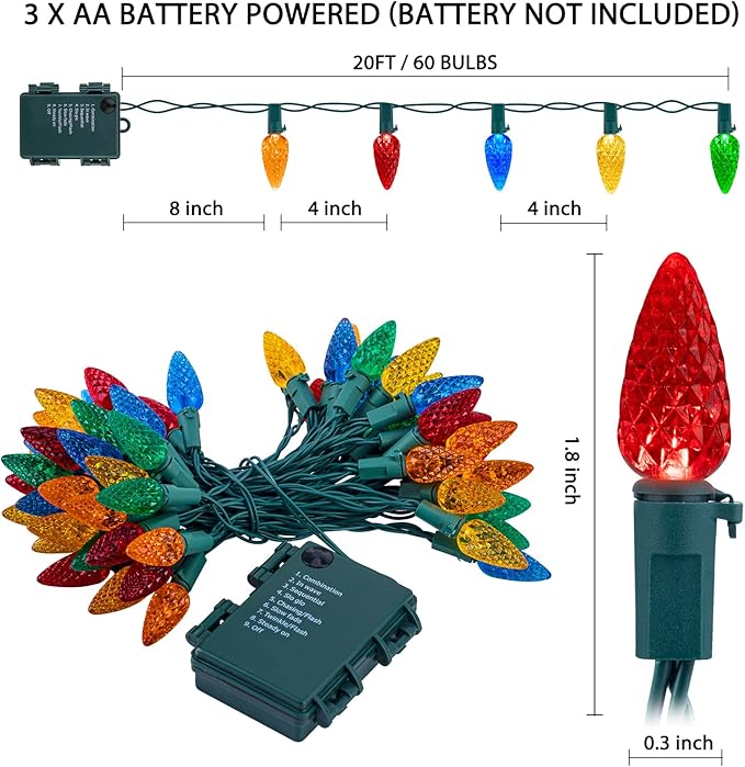 - 【 8 Lighting Modes 】- There are 8 different modes for the C6 Christmas string lights, including waves, sequential, slow glow, flashing, slow fade, twinkle, and combination, as well as standard on and off. It can be controlled by pressing the button on the battery box. Ideal for your everyday decor as well as holiday decoration.