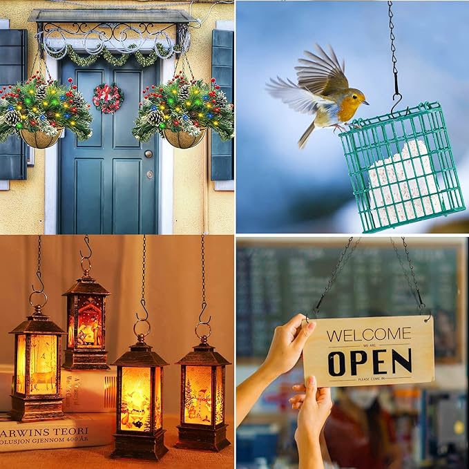 - 👍Wide Application - Endless uses of these chain hooks. Decorate your outdoor or indoor space by christmas lights decorations、christmas hanging basket, bird feeders, bird houses, plant baskets, flower pots, lanterns, wind chimes, shooting targets, isle markers and more. Tips:Each of our chains has 2pcs S hooks, which make the suspension stronger and safer.