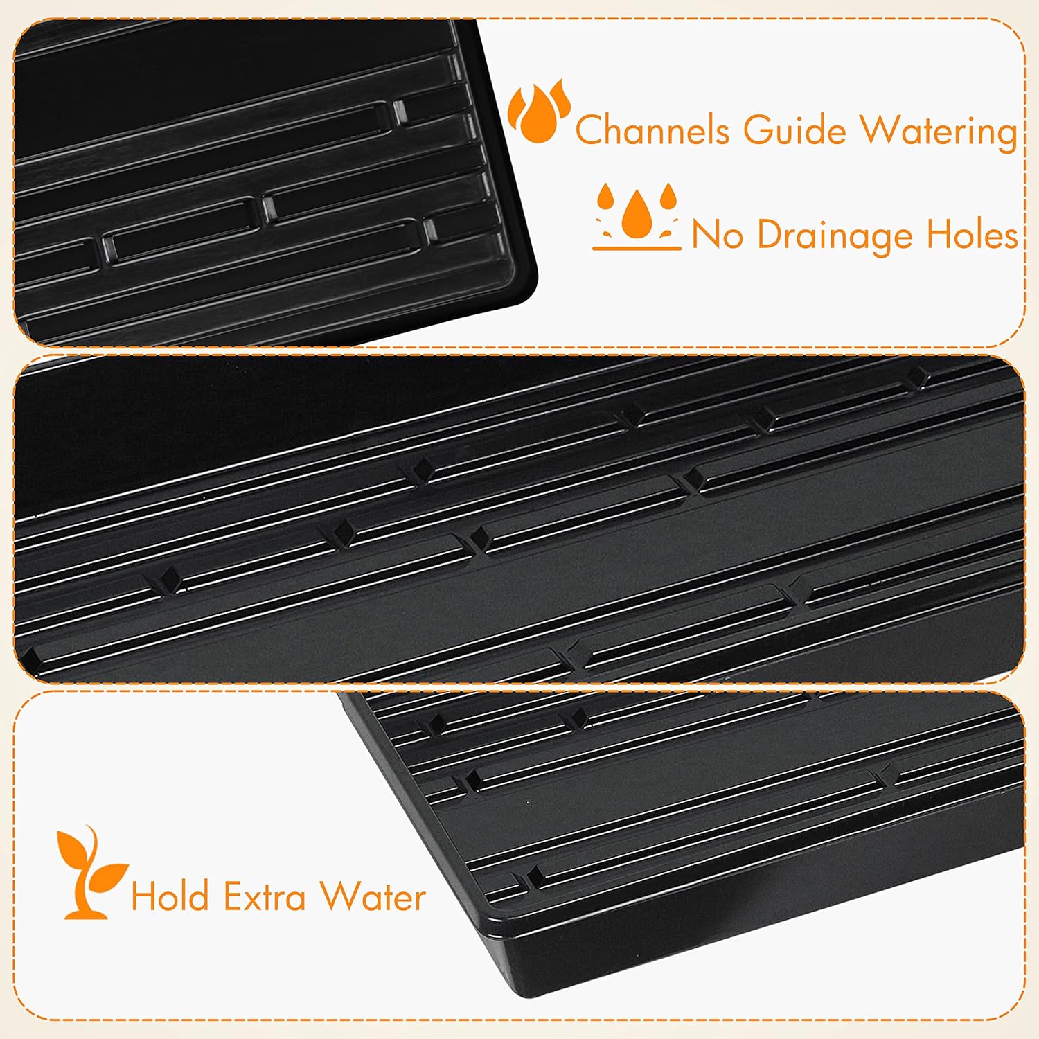 - Watering Guide - Each propagation tray has several channels for easy watering and accommodating drainage which enables plants benefit from the extra water to absorb humidity. There are no holes so you can water from the bottom, and plants are able to develop healthy root systems.