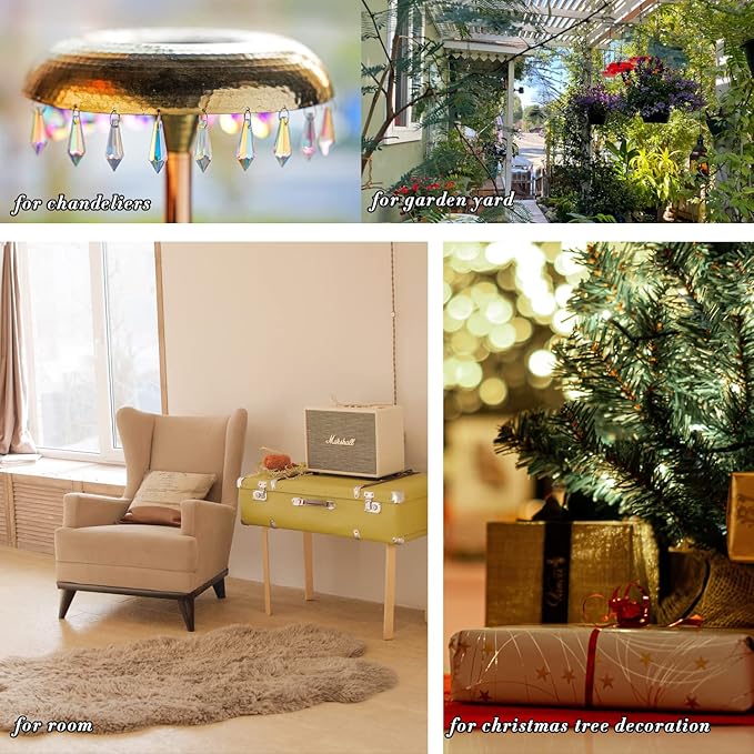 - MULTI FUNCTION-- Nice for Home Office Garden Window, Feng Shui Crystals, Chandelier Crystal Parts, Wedding Decoration, Christmas Tree Decor or any crystal projects. Good for sun catcher as a house, garden and car, It's also fun to turn these to enhance a new light fixture very pretty on your christmas tree, party decoration, DIY chandelier and more, get an amazing light and color show