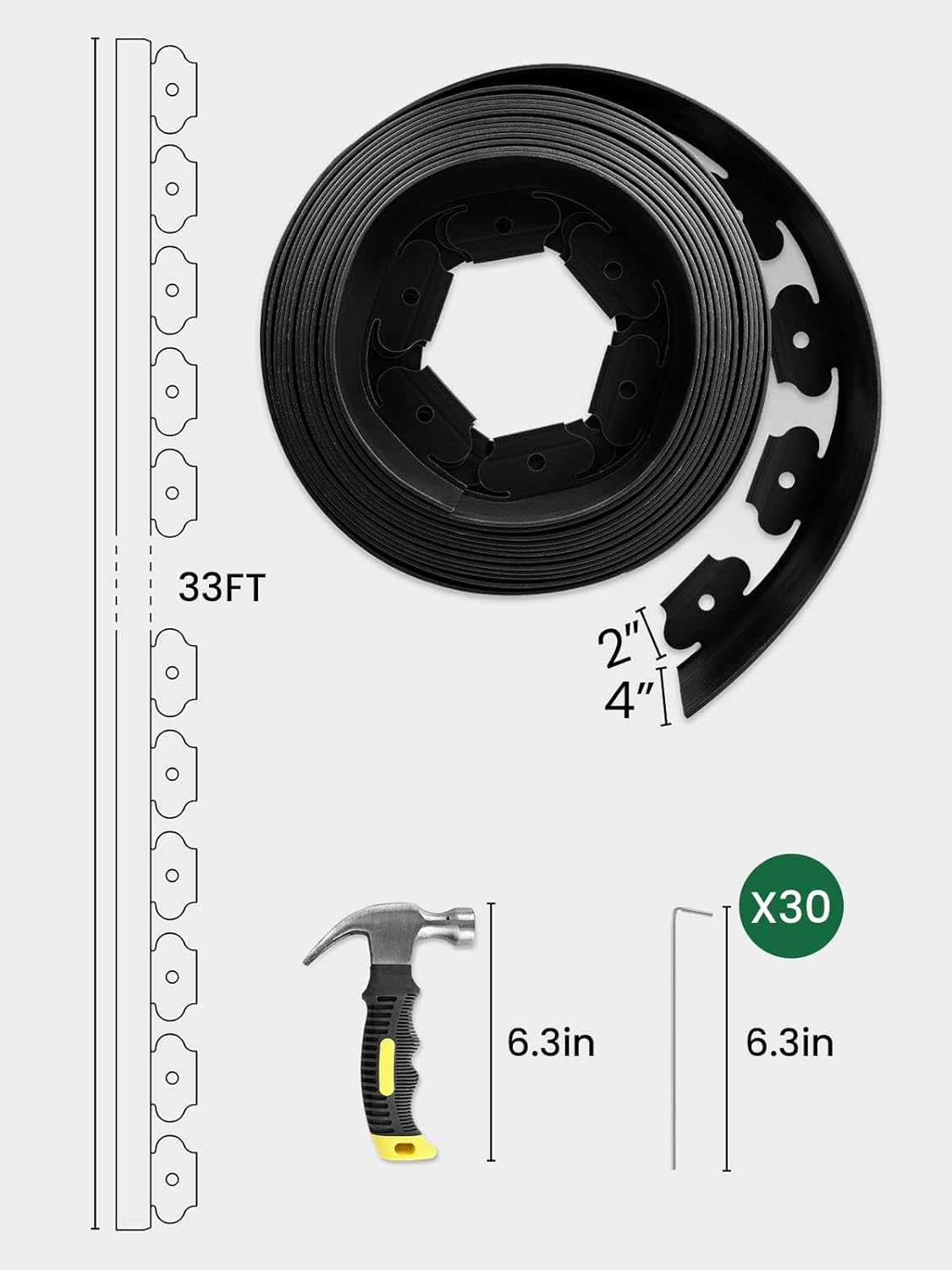 - ALL-IN-ONE KIT: the garden edging border comes with everything you need: 33 ft x 4 inch tall flexible edging for landscaping, 30pcs 6.3" galvanized steel spikes, and a 6.3" hammer. No need to prepare extra tools — start your landscaping project right out of the box.
