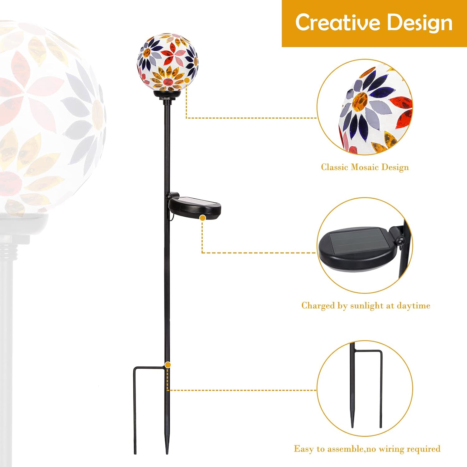 - ★Unique design: Solar garden lights add fun to your garden, patio or pathway. Artistry mosaic ball can reflect light via crackle-like glass from every angle under the sun.