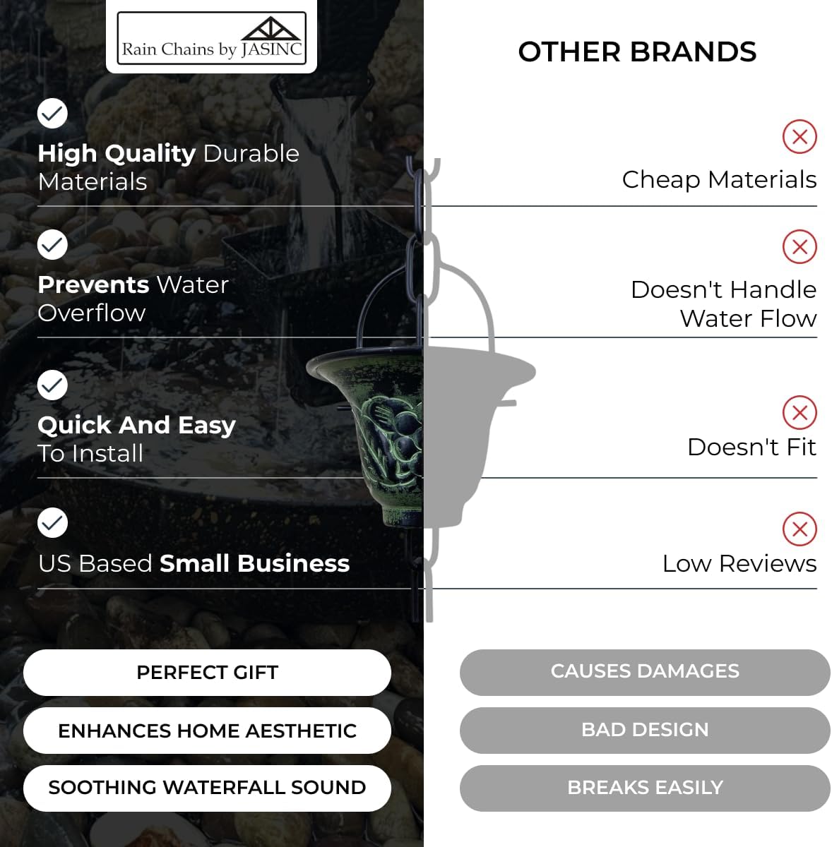 - RAIN CHAINS BY JASINC QUALITY ASSURANCE: we use only top quality materials for all our rain chains and accessories. We focuses on preventing defects, enhancing reliability, and maintaining customer satisfaction through continuous improvement.