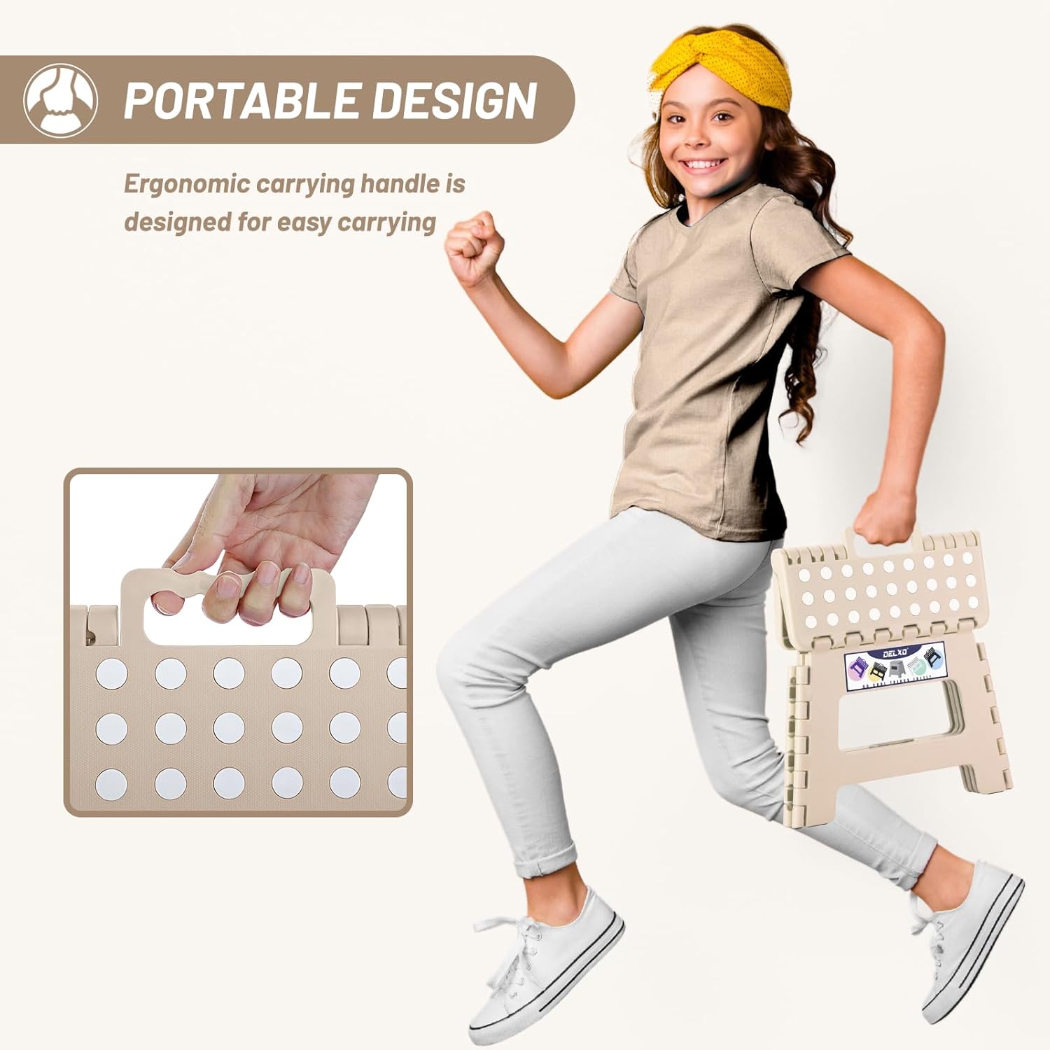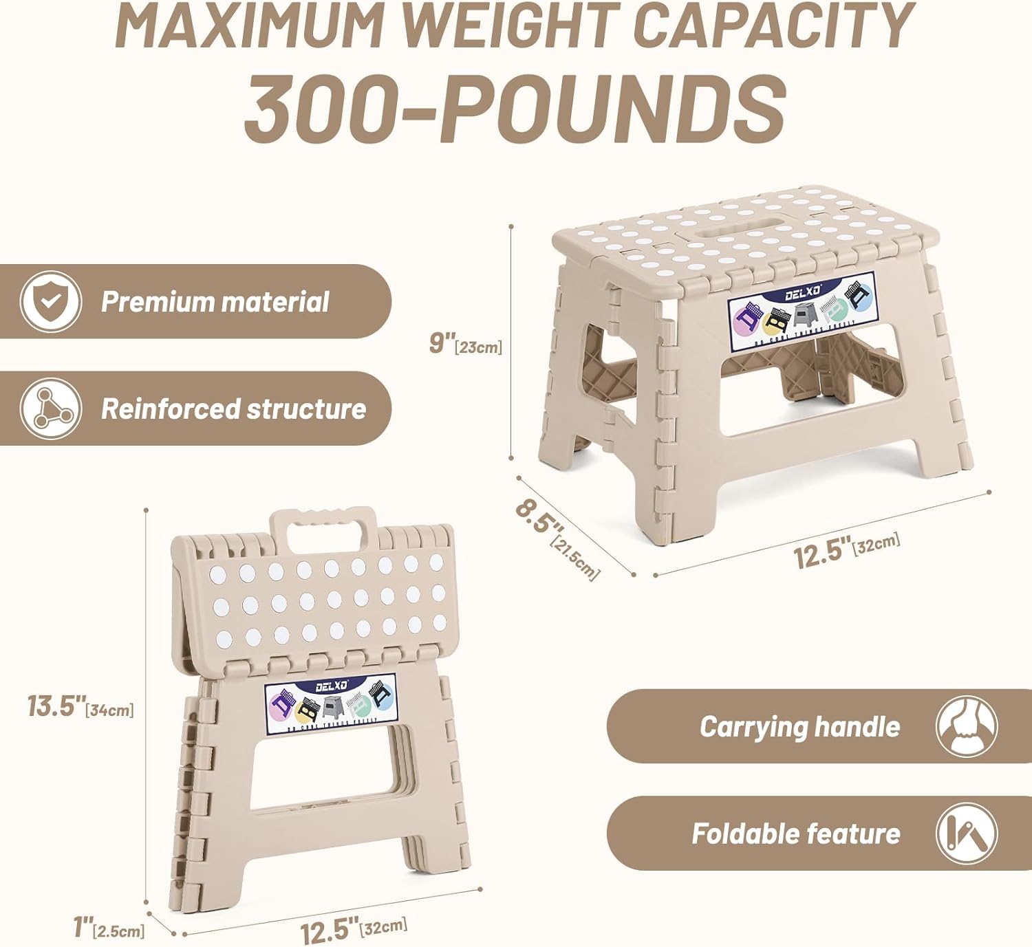 - Safe Upgrade Step Stool : Features improved the folding bar,which can prevent from collapse inward while Steping on it.Delxo have designed a safety stop gap feature that allows the foldable stool to prevent being squashed. Four round corner super safe protect your body from clashing. All of this design is put your safe first