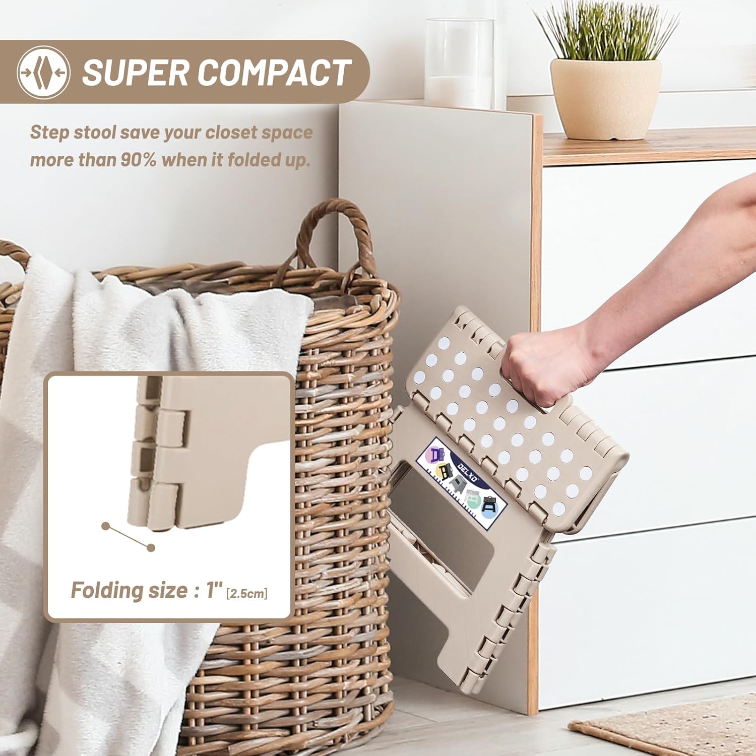 - Space Saving Foldable Stool : Delxo step stool save your closet space more than 90% when it folded up.It's quickly and easily folds away for convenient storage so you can opens with one flip of the hand.Also you can hides them in corner at home because it's so compact