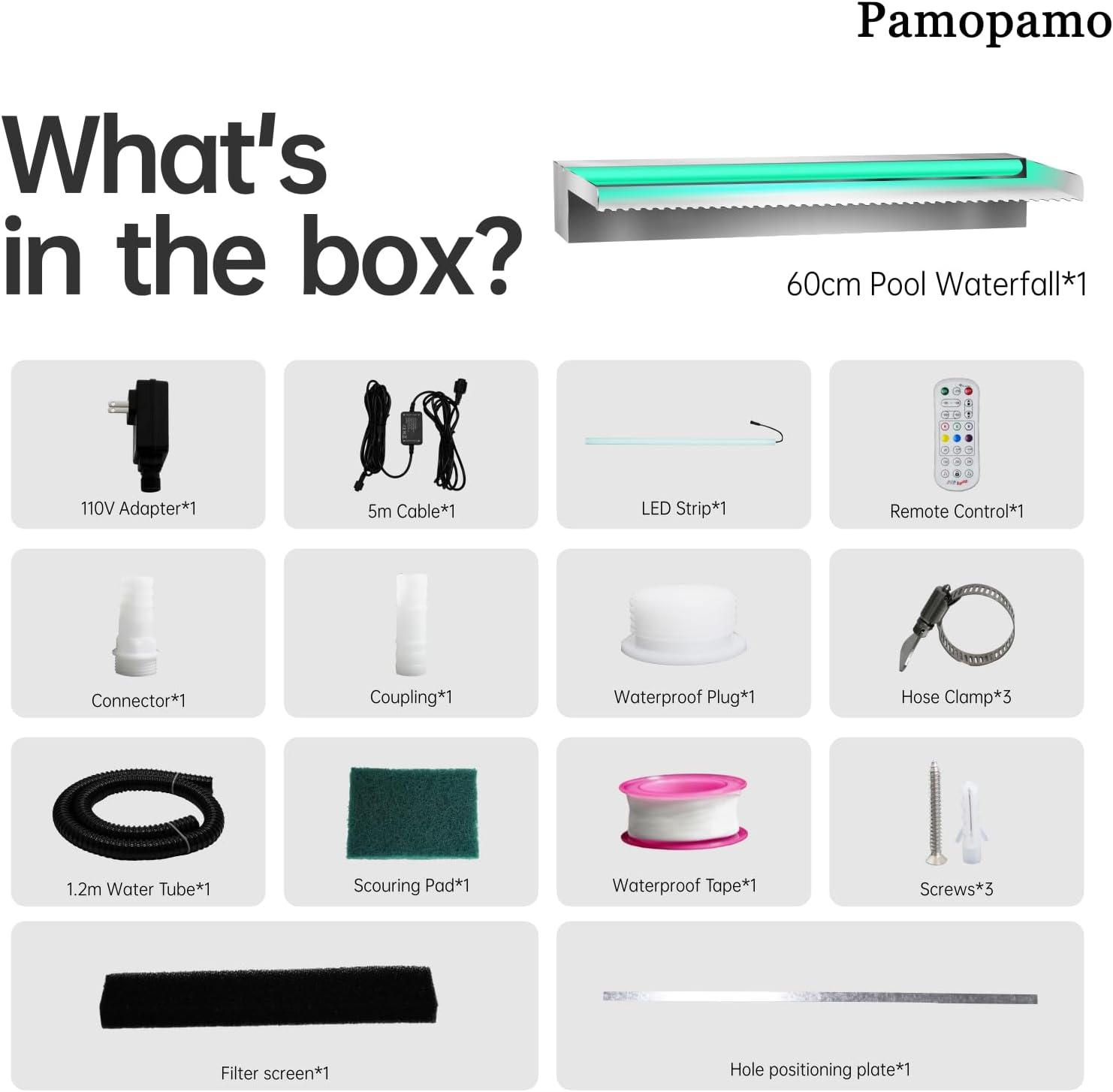 - ⏩App Control Waterproof Lights⏪ Pamopamo pool fountain is equipped with a waterproof LED light strip which can change multi colors via the RF remote or APP control. You can experience different modes through the mobile app, such as music mode, light mode, voice mode, etc.(When you can open the light strip cover, you will find that all the light beads inside have been waterproof. They can directly soak in water)