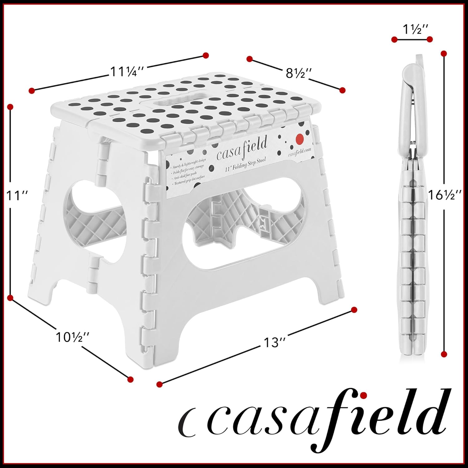 - Textured, grip-dot surface: The unique design of Casafield's folding step stool includes a stylish and textured, grip-dot, no-slip step surface, making this stool safe to use for adults and kids alike. The step surface measures 11.25" W x 8.5" D, providing plenty of footing space.