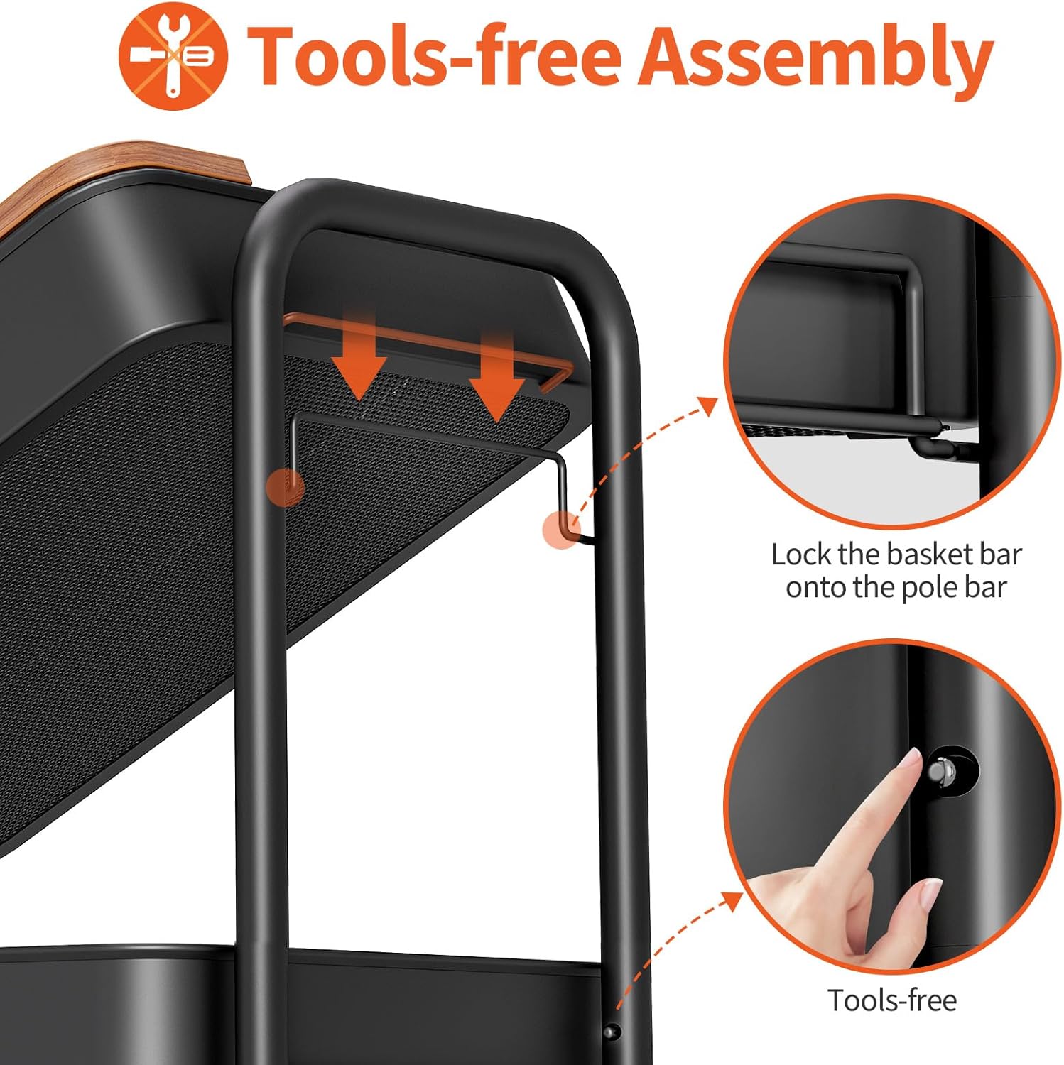 TOOLF 3-Tier Rolling Cart with Table Top, Metal Storage Cart on Wheels, Utility Organizer with Wooden Tray, Lockable Casters, Easy Assembly for Bathroom, Living Room, Office, Kitchen, Black