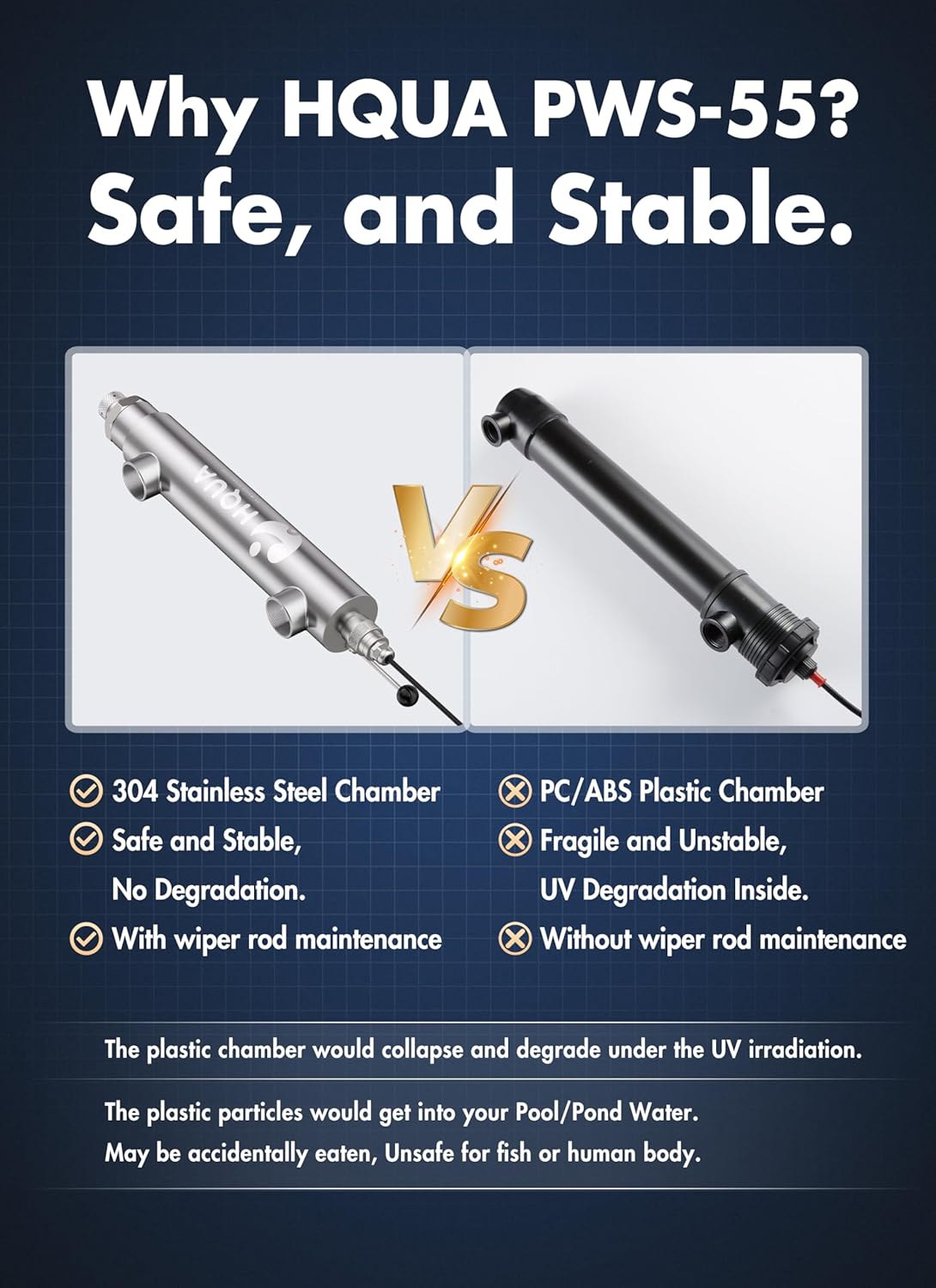 - Safe to use, No Degradation. Protect the living creatures in the pond, swimming person in the pool. This Stainless-Steel unit doesn’t have a problem of degradation. The UV light would degrade the PLASTIC reactor and cause a potential damage to your fishes and living creatures in the pond. Image the fishes and living creatures in the pond eat plastic particles or people get sick if they swim in the pond or pool.