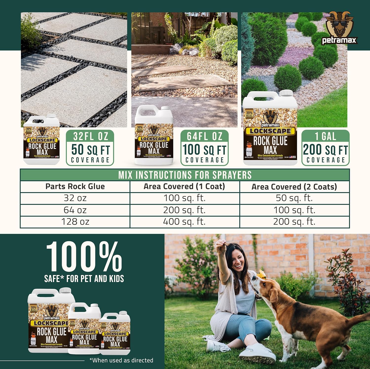 - COVERAGE GUIDE: 32 oz bottle covers approximately 50 square feet (the size of a small patio) – for larger landscaping projects, consider our 64 oz (100 sq ft), 1 Gallon (200 sq ft), or 2.5 Gallon bottle that covers an impressive 500 square feet of rock landscape!