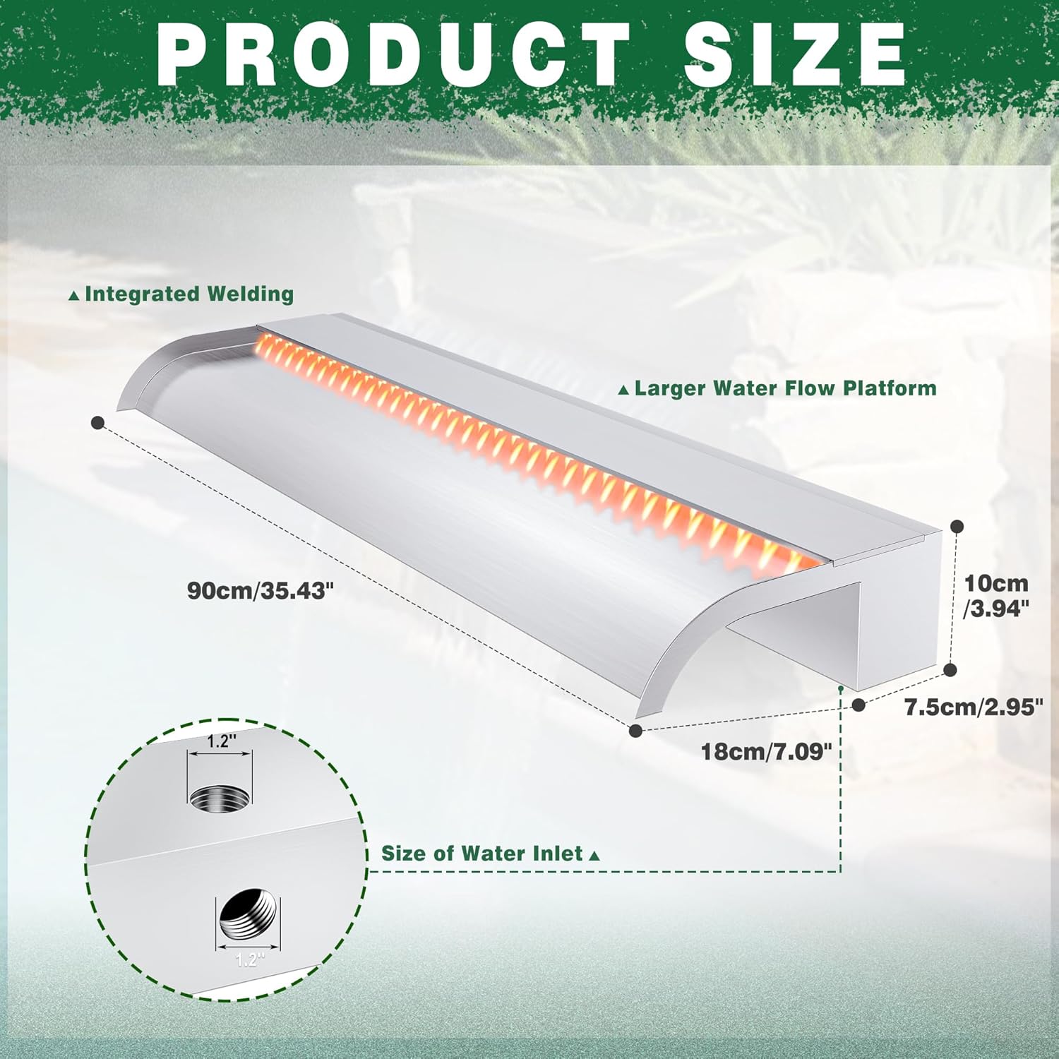 - 【Stainless Steel Waterfall】 The main body of the stainless steel waterfall spillway is welded together using 304 stainless steel, providing durability for long-term use, ensuring rust-proof and no water leakage. The open lip design creates an elegant, invigorating freefalling water effect for your swimming pool or pond