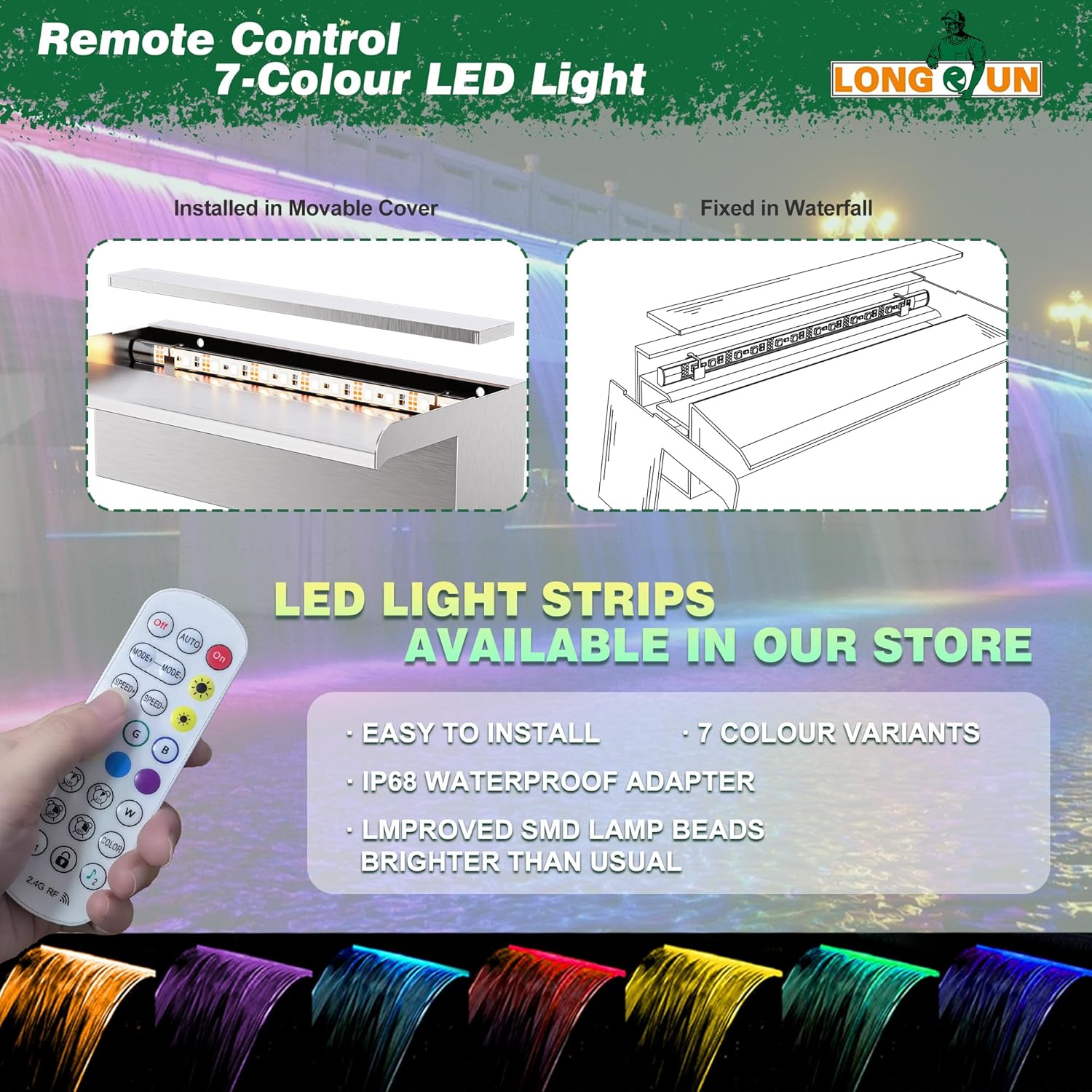 - 【DIY Decoration Pool & Pond fountain】LONGRUN waterfall spillway will make a decorative addition to your garden patio pond or swimming pool, it makes them more elegant, fashionable and beautiful. The color change of LED lights and the gentle sound of water running make your patio more special at night