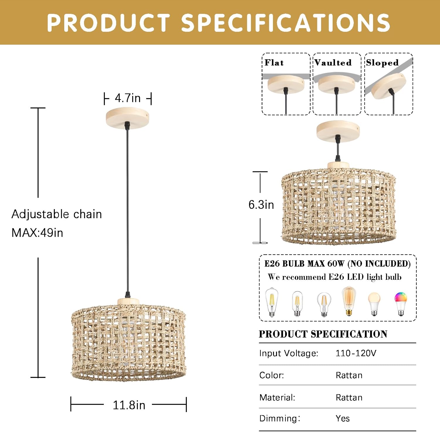 - ⭐【Wide Application】This rattan pendant light is made of delicate rattan woven, high-quality wires and thickened ceiling panels, which is perfect for farmhouses, dining rooms, kitchens, living rooms, bedrooms, hallways, cafes, bar, entryway, etc.