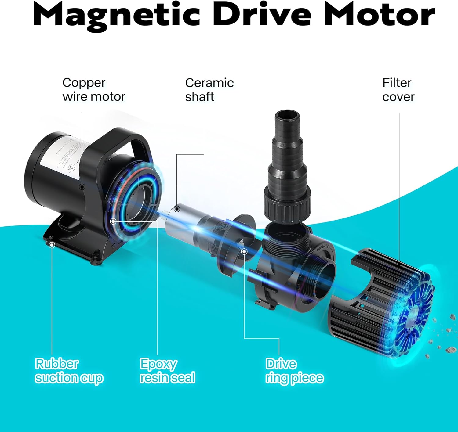 - HIGH LIFT & LARGE FLOW - This pond pump boasts a high-quality copper wire motor and employs advanced magnetic drive motor technology for exceptional performance, energy conservation, and stable operation; With a power rating of 100W, it achieves a maximum lift height of 14ft and a flow rate of 1600 GPH