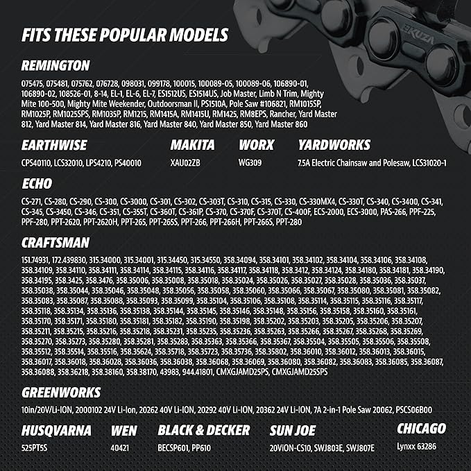 - Versatile Compatibility Fits a wide range of chainsaw models, including: Worx, Echo, Craftsman, Sun Joe, Makita XAU02ZB, BLACK & DECKER BECSP601, LCS1020B. Check the full compatibility list below to find the perfect fit for your saw.