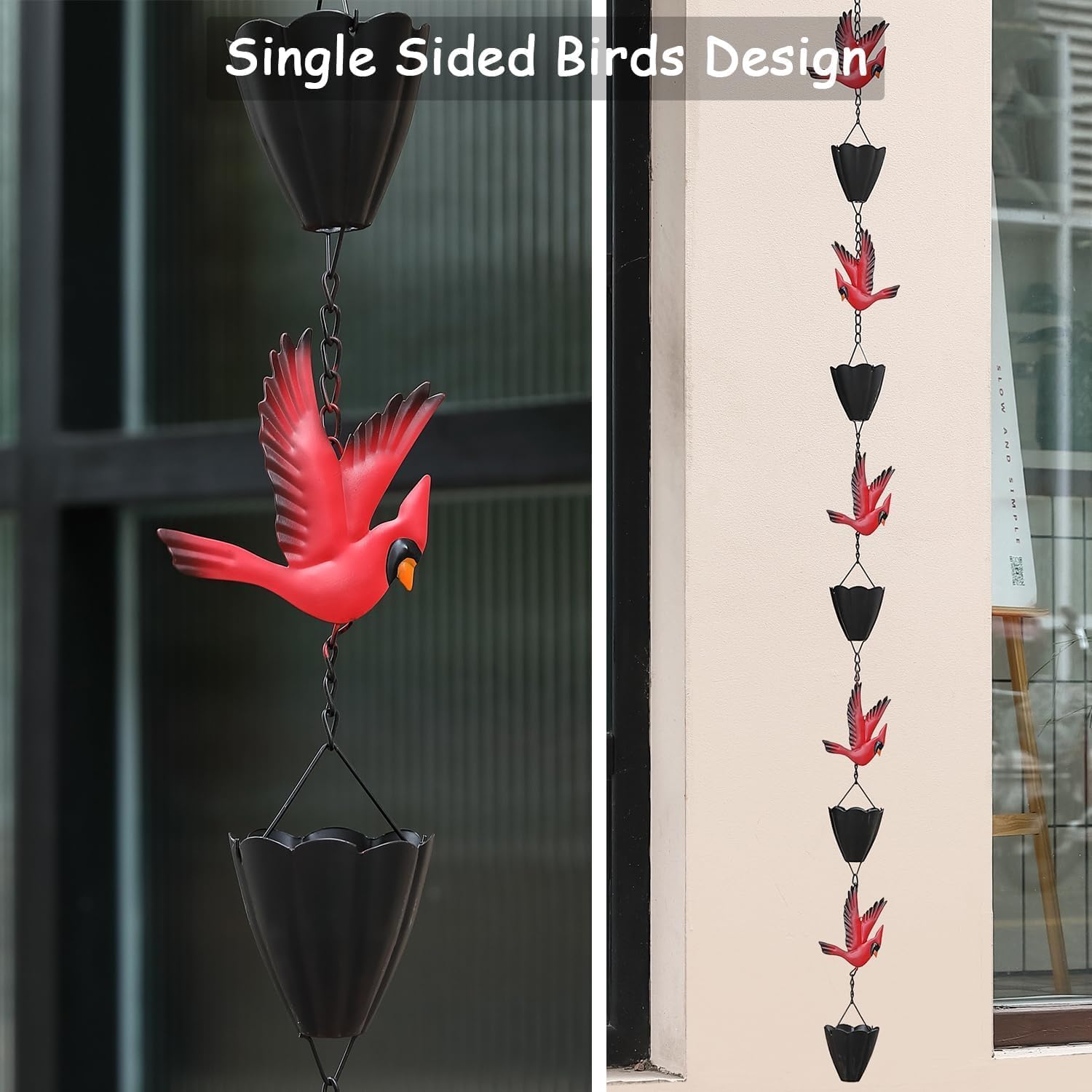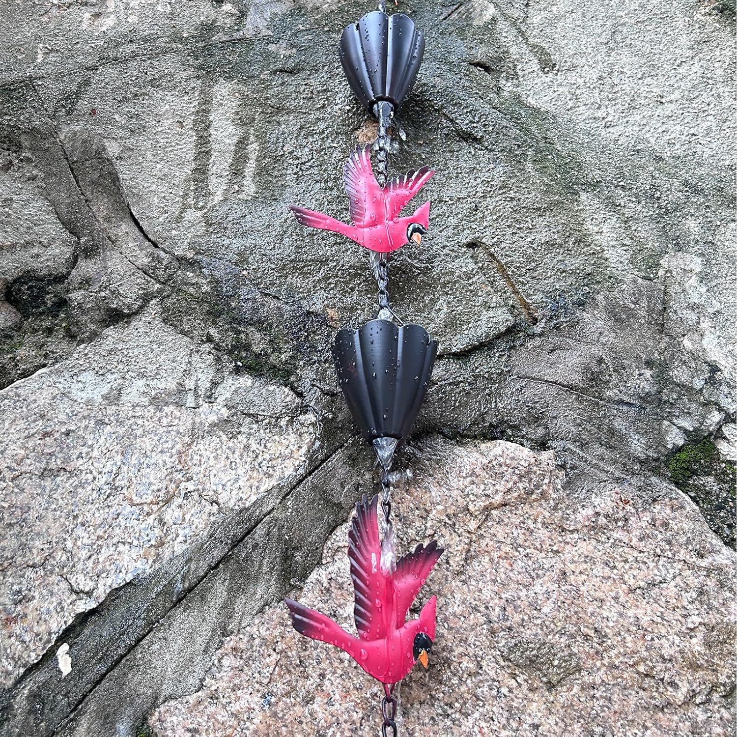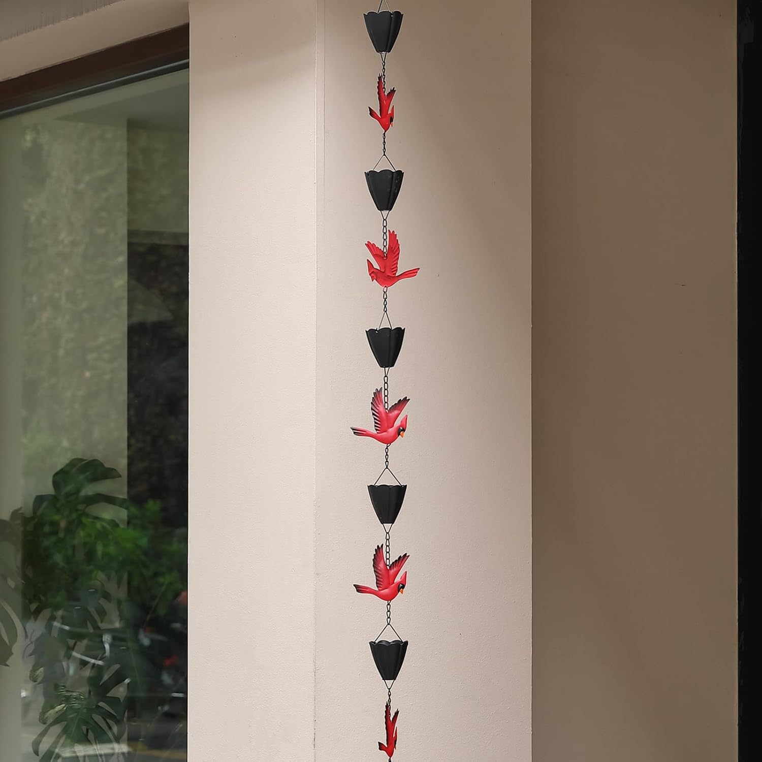- 🦜 Cardinal Rain Chains: This decorative rain chain is uniquely designed and consists of 8 vivid cardinal birds and 9 vintage elegant cups. The edge of bird feathers is black, which makes them look less boring. The collision of black and red adds a touch of mock examination flavor to the whole rain gutter chain.