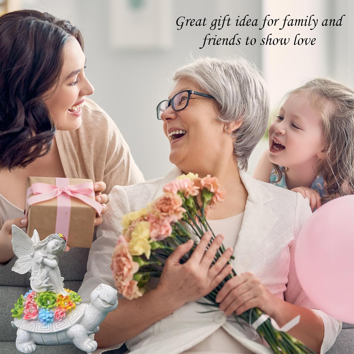 Garden Statues Outdoor Decorations Solar Turtle Angels Decor with Succulents LED Lights Garden Ornaments Figurines for Patio Yard Lawn Gifts for Women Grandma